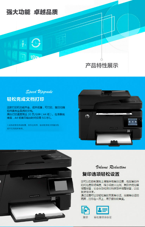 參數(shù) [商品名稱] 惠普HP LaserJet Pro MFP M128fp [打印功能] 非自動 [連接方式] 有線,USB [雙面類型] 支持輸稿器 [黑白最大支持幅面] A4紙 [掃描功能] 平板式+饋紙式 [基礎(chǔ)功能] 打印,復(fù)印,掃描,傳真