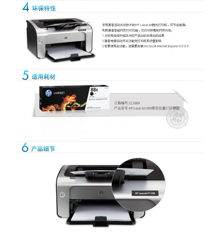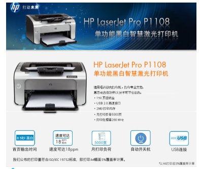 參數(shù) [商品名稱] 惠普(HP)P1108 [最大支持幅面] A4 [打印速度] 18頁(yè)/分 [品牌] 惠普(HP) [型號(hào)] P1108