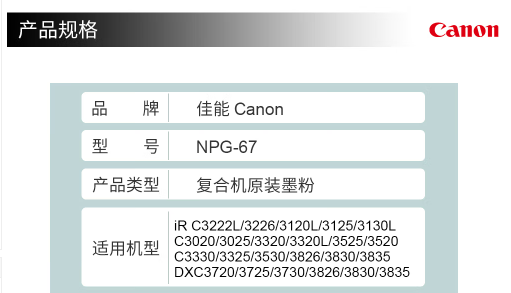 參數(shù) [商品名稱] 佳能(Canon)NPG-67 Toner [類型] 原裝 [耗材類別] 粉盒/粉倉(cāng) [顏色] M 品紅/洋紅