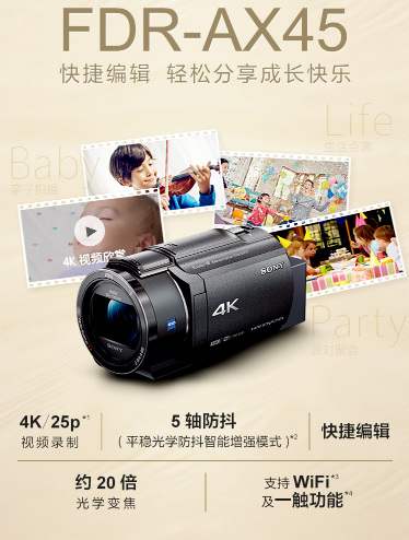 參數(shù) [品牌] 索尼 [型號] FDR-AX45A [毛重] .0kg [產地] 中國大陸 [類型] 輕巧便攜 [單位] 套