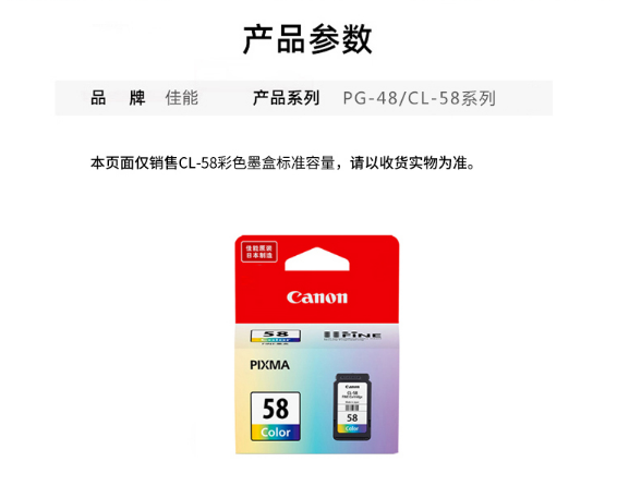 參數(shù) [品牌] 佳能 [型號] CL-58 [毛重] 60.00g [產(chǎn)地] 中國大陸 [類型] 帶頭墨盒 [單位] 個(gè)